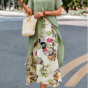 Sage Green Fake 2in1 Leaf Print Dress