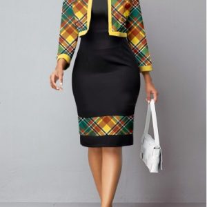 Avocado Green Mermaid Geometric Print Two Piece Suit Dress and Cardigan