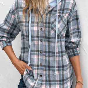 Dusty Blue Pocket Plaid Long Sleeve Hooded Coat