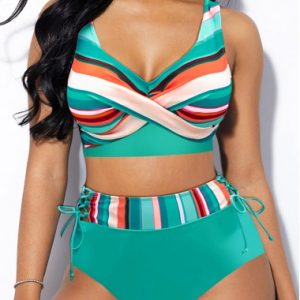 Double Straps Drawstring Striped Black Bikini Top
