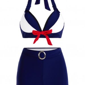 Bowknot High Waisted Tribal Print Blue Bikini Set