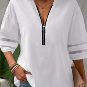 Grey Zipper Short Sleeve Round Neck Blouse