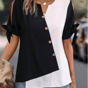 Contrast Color Patchwork Short Sleeve Split Neck Blouse