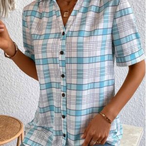 Light Blue Button Plaid Short Sleeve Blouse