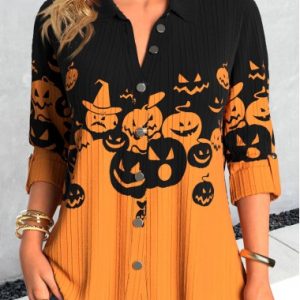 Purple Button Halloween Print Long Sleeve Blouse