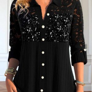 Black Button Short Sleeve Shirt Collar Blouse