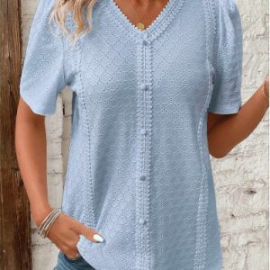 Blue Button Short Sleeve V Neck Blouse